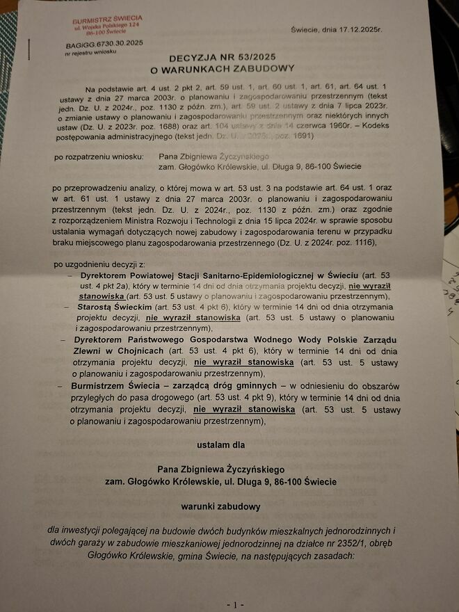 Świecie-Działka budowl inwest w Głogówku. Czytaj ogłoszenie.